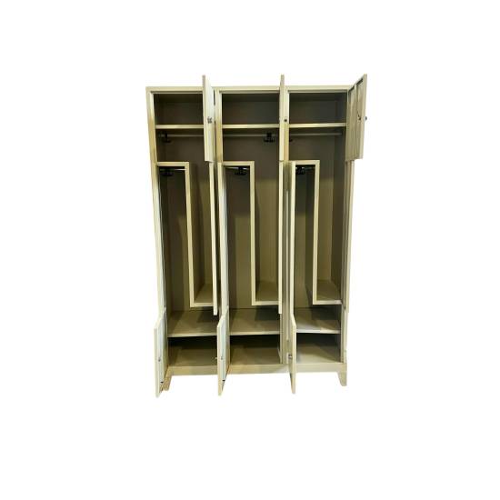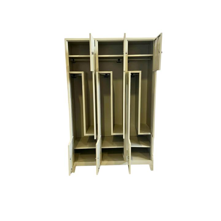 Dette garderobeskapet er et pent skap for garderoben med totalt 6 rom. Det har en gråaktig farge som gjør at det passer inn mange steder. Det er god plass til oppbevaring, hvor det både kan henges opp jakker, plasseres sko, og det er god plass til treningsbagen.